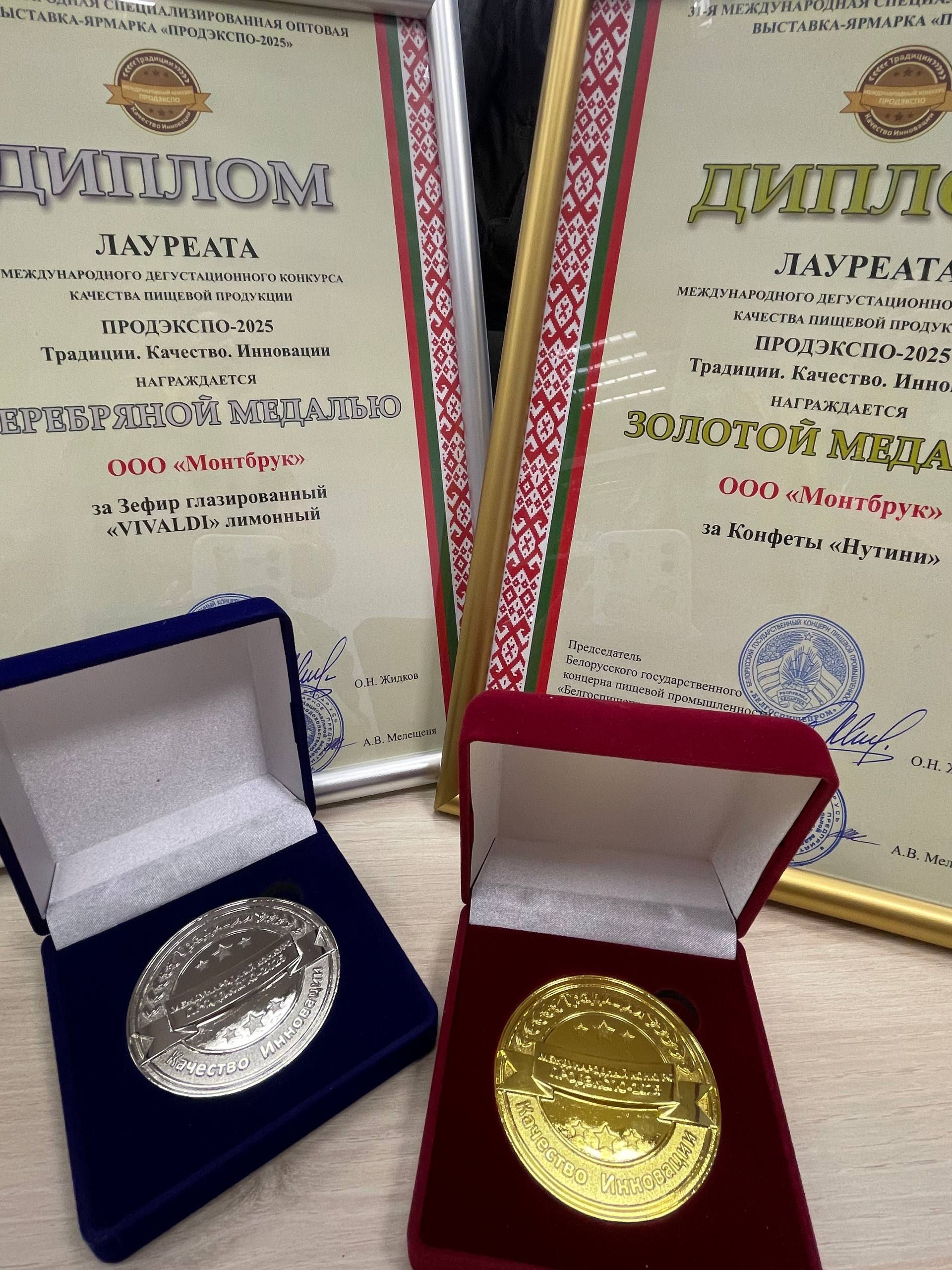 Мы рады паведаміць, што наша кампанія была ўдастоена залатым медалём за цукеркі "Нуціні", якія заваявалі прызнанне за сваю высокую якасць і ўнікальны густ. Таксама мы ганарымся тым, што наш зефір глазураваны "VIVALDI" цытрынавы атрымаў сярэбраны медаль. Гэтыя ўзнагароды пацвярджаюць нашы імкненні да дасканаласці і інавацыям у вытворчасці прысмакаў.