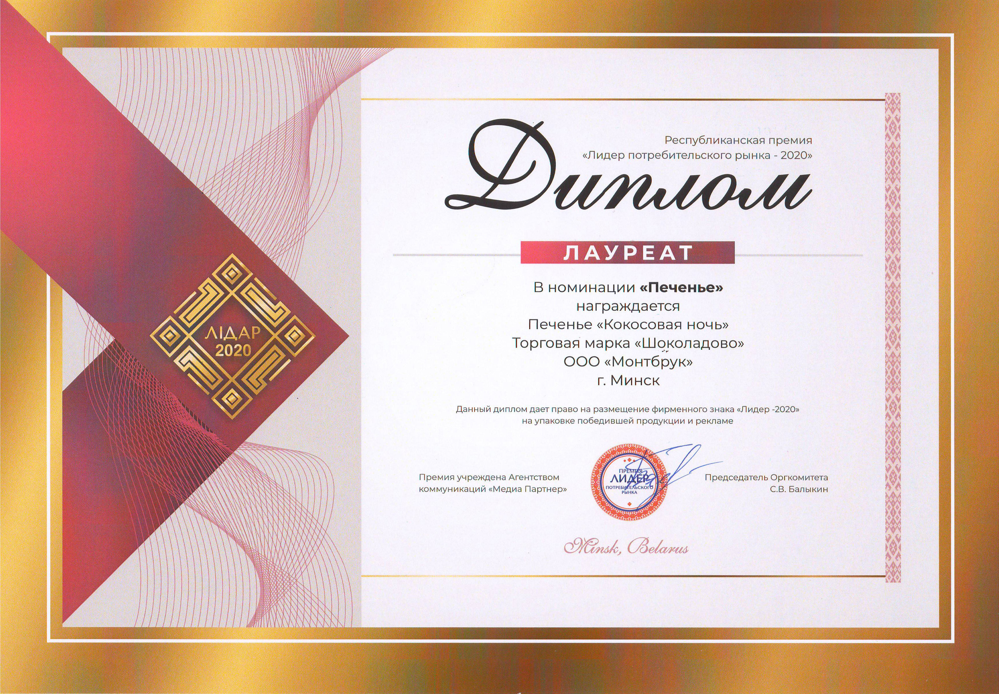 Заслуженные награды вновь в копилке нашего предприятия. Продукция торговой марки Шоколадово стала лауреатом среди лучших Лидеров Республиканской Премии «Лидер потребительского рынка - 2020».